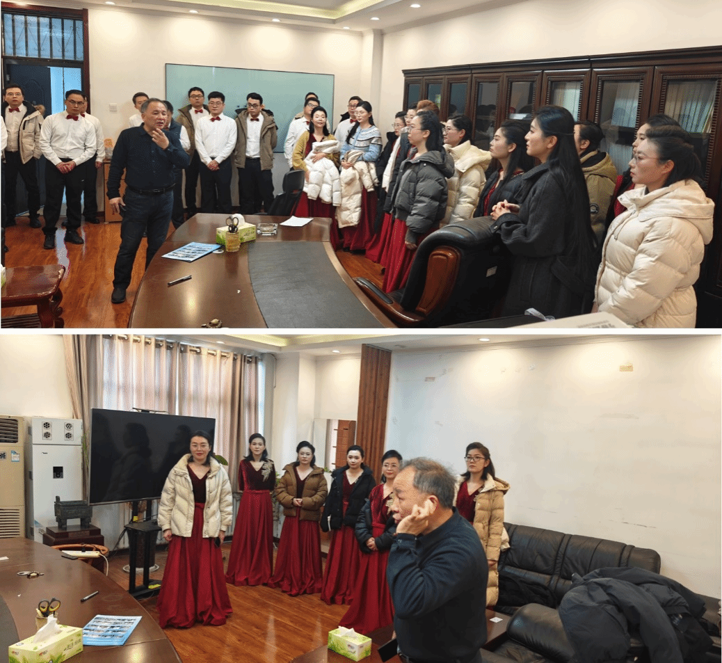 (图为比赛前教职工们在学院会议室进行最后一次合练)
